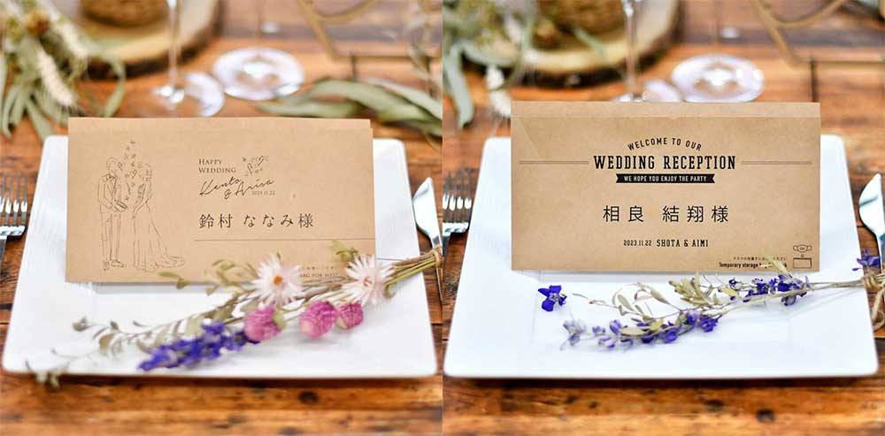 参考:(左)クラフト席札(印刷込)/(右)席札「シエラリーフ」完成品オーダー(入力印刷込)