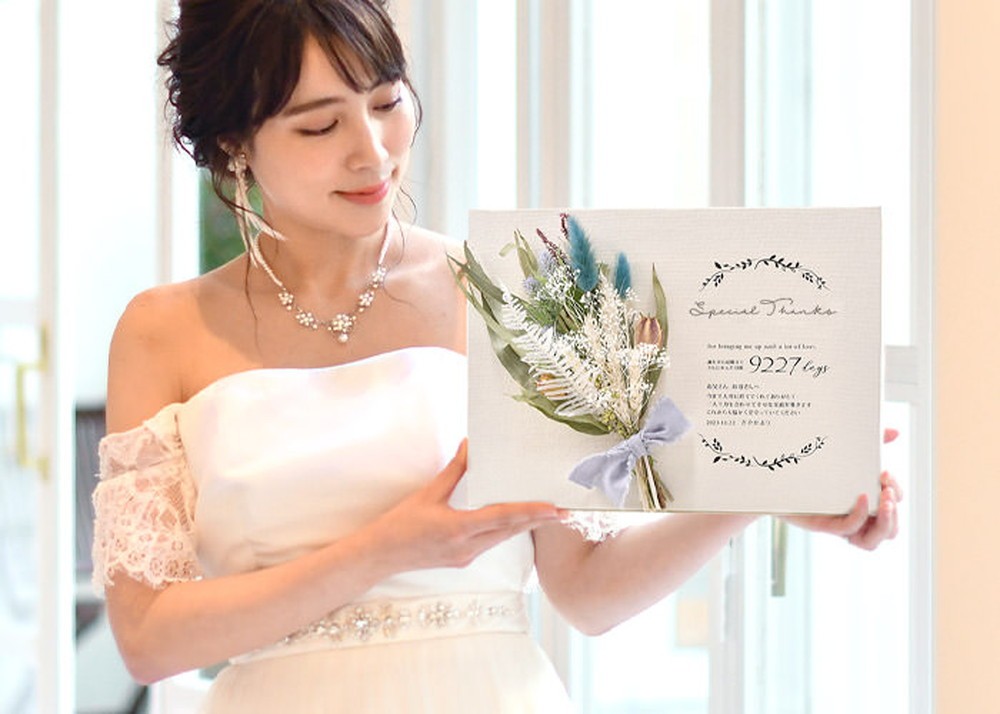 定番なのは、両親や家族に宛てた手紙を用意すること。自分の思いを手紙にしたためて、両親へ贈ったという卒花さんも多くいます。シンプルな便せん以外にも、結婚式後にインテリアとして使えるおしゃれなボードタイプも人気です。