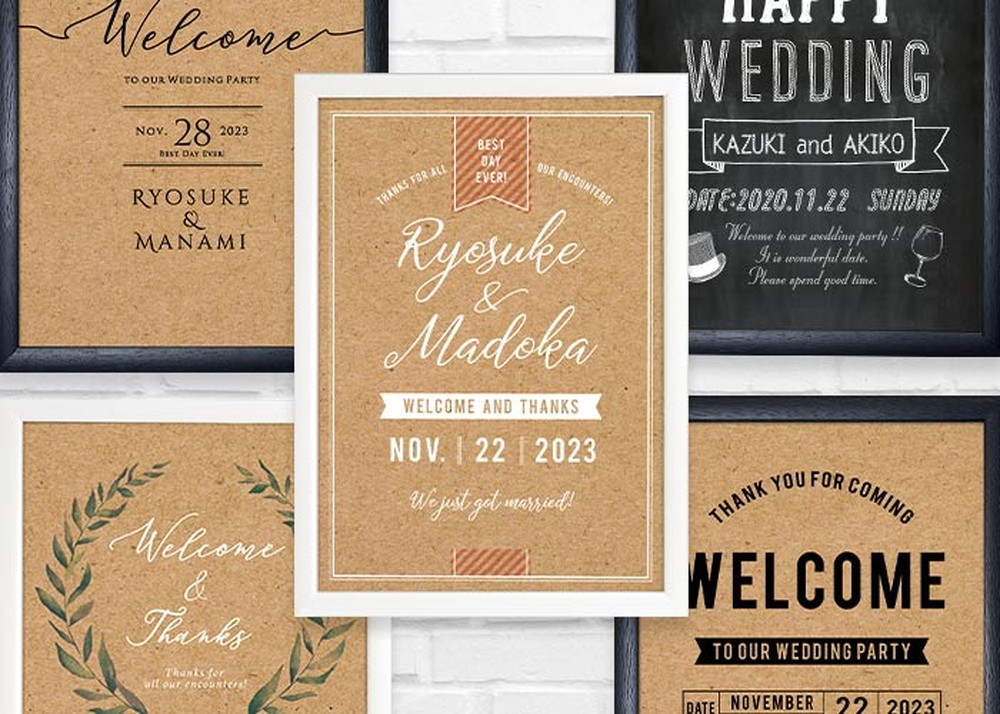 クラフト風やブラックボード(黒板)風など甘くなりすぎないおしゃれなデザインが全9種類。飾るだけで受付スペースがスタイリッシュな雰囲気のある仕上がりに。