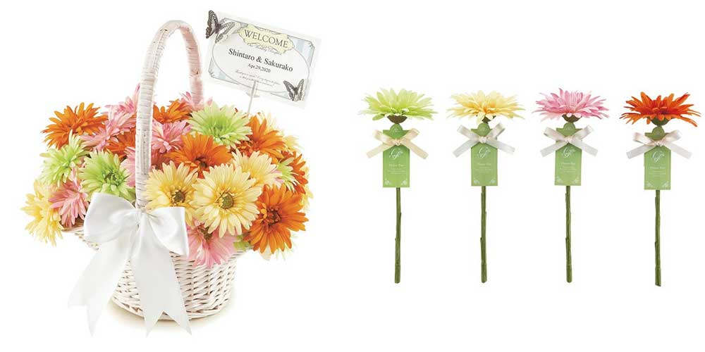 色々なカラーのお花ペンを準備したいなら、コチラのガーベラがオススメ。全部で4色のお花がアソートになっています。ゲストがどのお花を選ぶのか想像するのも楽しいですね。