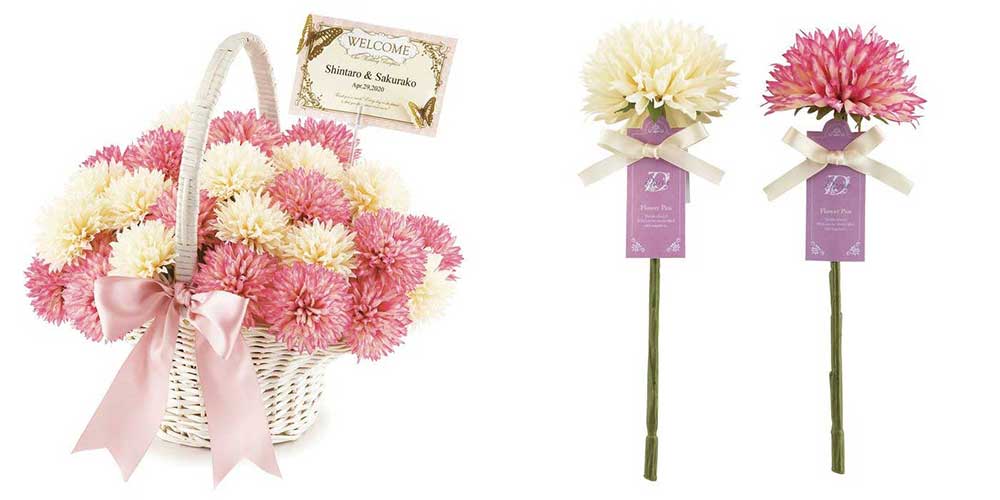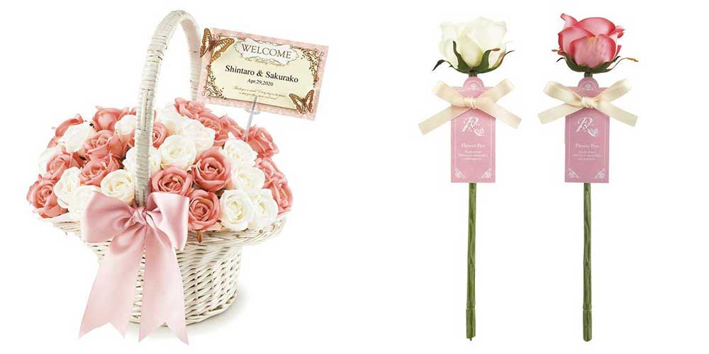 他にも、ウェルカムオブジェプチギフトとして使えるバスケットにセットされた状態でお届けのコチラは、かご、カードスティック付きなので、一見お花のウェルカムブーケみたいですよね!実はこれがペンだなんてビックリです!受付にそのまま飾ってゲストのお出迎えアイテムとしてそのまま使えます♡