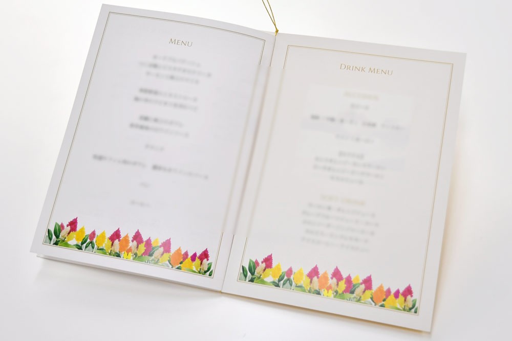 中面は席次表、ご挨拶文、プロフィール(写真付き)メニューなどを記載。