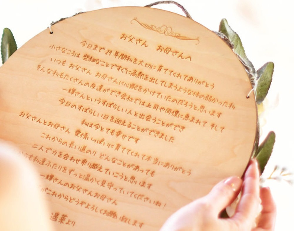 手紙はその場で読むだけでなく、形として残したいという人も多いでしょう。直筆の手紙が刻印できる特別仕様の木製のボードは、そのまま両親へのギフトにもなるのでおすすめですよ。