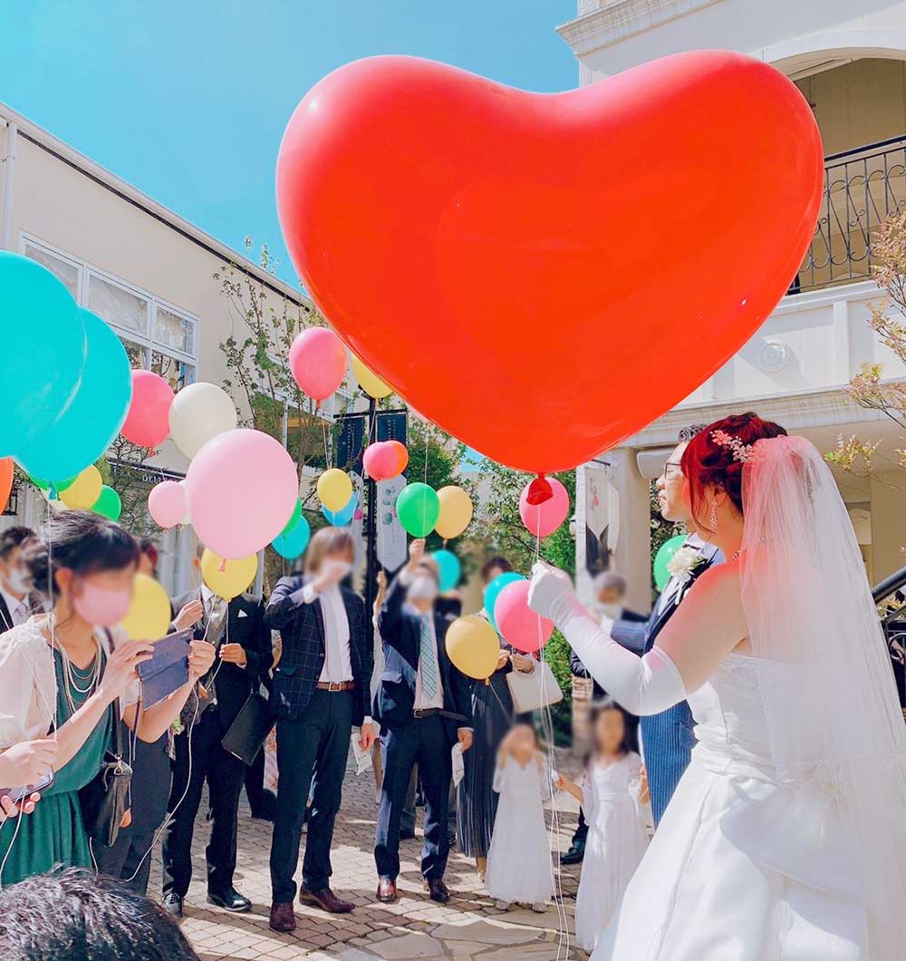 結婚式の演出として人気のバルーンリリース。新郎新婦さんの大きな赤いハートのバルーンがかわいいです♡
