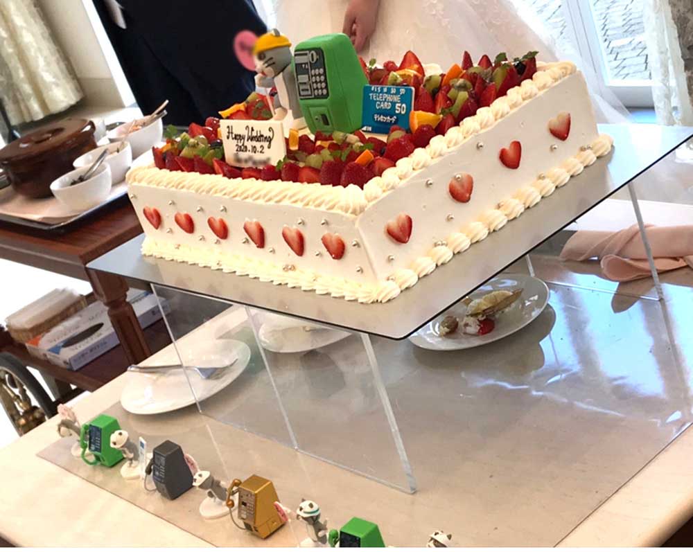 お仕事テーマに結婚式の世界観を作られたお二人。ウェディングケーキだって、公衆電話とかわいい仕事猫ちゃんがデコレーションされたオリジナリティあふれるものに。テーブルの上までしっかり統一感のあるデコレーションに♪ゲストも思わずほっこりしてしまう演出ですね(*^_^*)