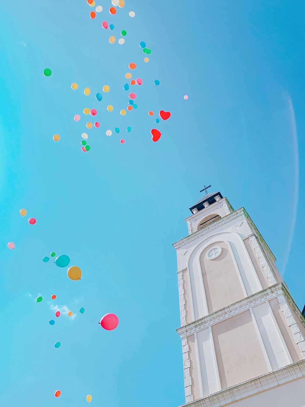 お二人は当日のお天気にも恵まれたそうで、頂いたお写真も色とりどりの風船が青い空に映えてとっても素敵!ゲストと一緒に盛り上がった瞬間だったのではないでしょうか(*^_^*)