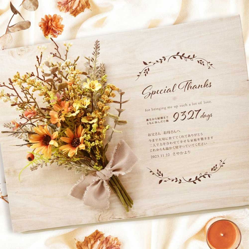 結婚式の贈呈品などには、生花ではなく、美しいままキープできるアーティフィシャルフラワーを選ぶのオススメ。人気があるのは、スワッグブーケタイプの子育て感謝状。アーティフィシャルフラワーのアレンジなら、結婚式当日の彩りのまま、ずっと変わらない状態で飾ることができますよ。