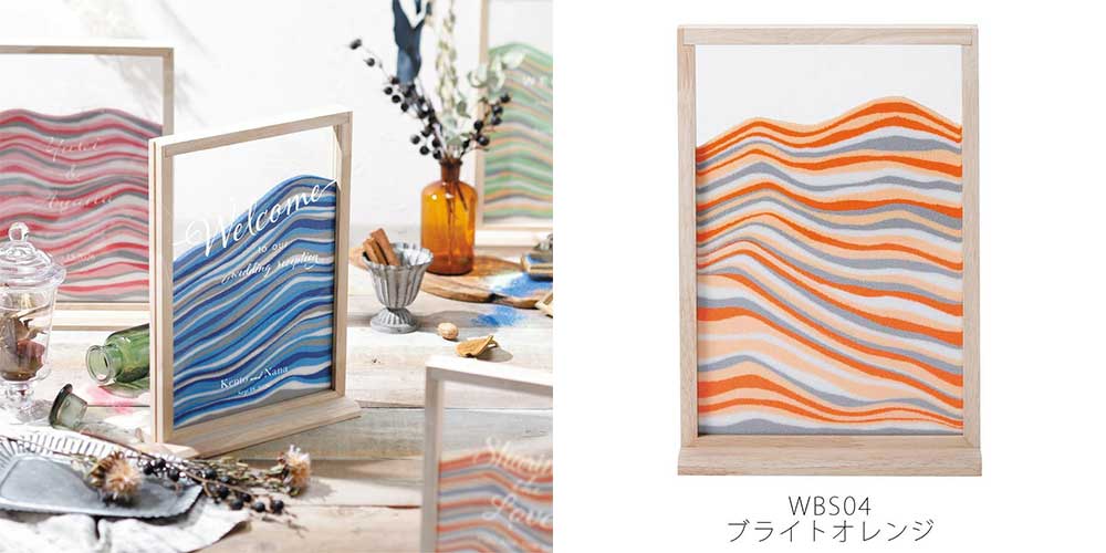 こちらはウェルカムスペースでゲストに完成させてもらう演出アイテム。砂の色が作り出す模様によって、世界にひとつしかないオリジナルアートを完成させることができるので、挙式後は大切な思い出として飾ることができますよ。今回はこの中のオレンジカラーをチョイス!色の組み合わせも絶妙にオシャレで、インテリアとしても映えそうです。