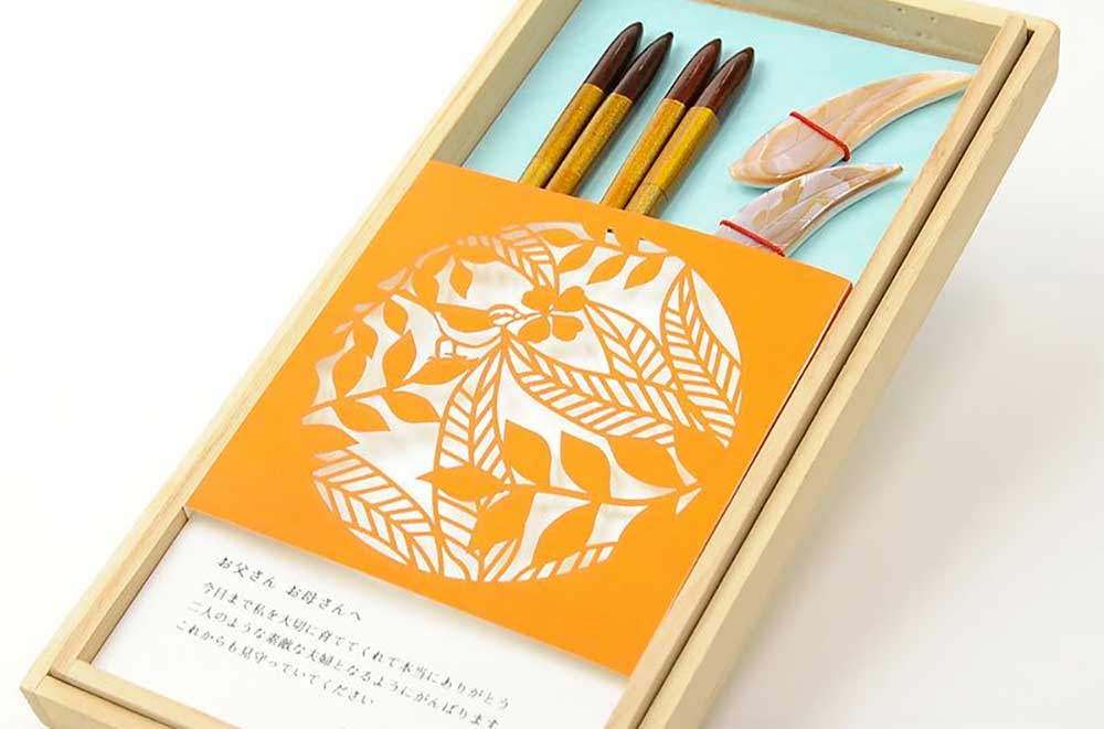 ご両親へのギフトにも、秋の紅葉を思わせるような、オレンジリーフのデザインペーパー付の夫婦箸セットはいかが?繊細な切り絵風のデザインペーパーがプレゼントらしい特別感を演出しています。桐箱入りなので、記念日ギフトにも最適です。