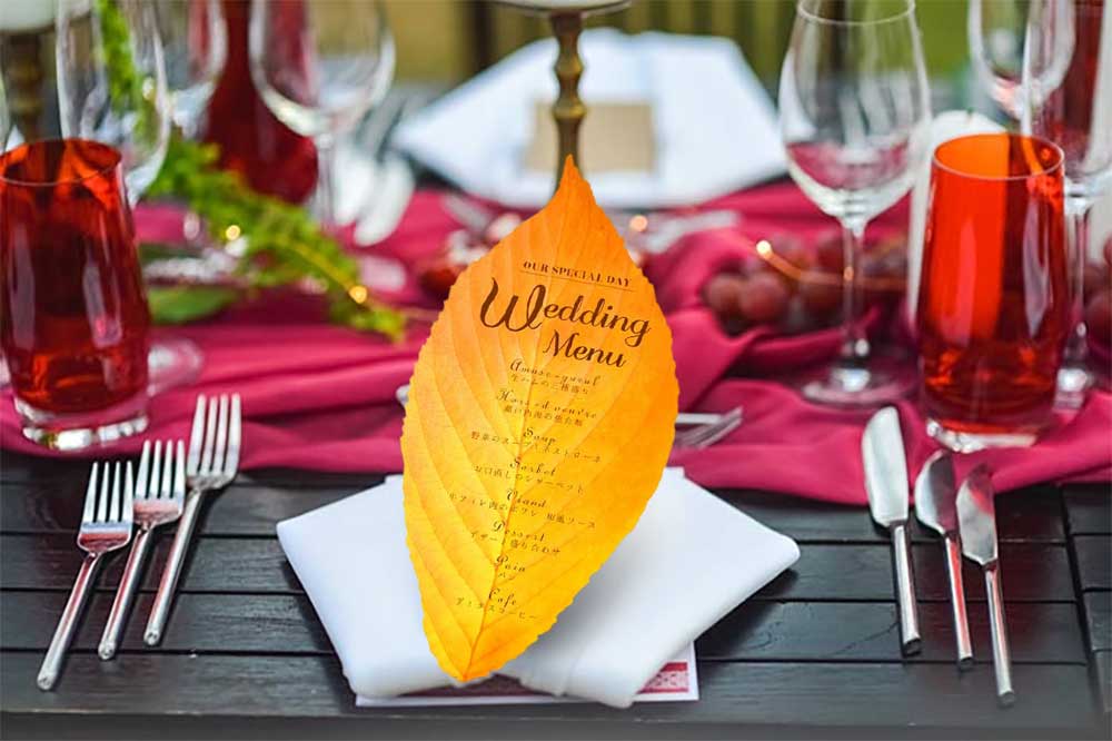 この紅葉の景色をテーブルコーデにも取り入れるこんな裏ワザが!なんとこちらはペーパーアイテム。しかもメニュー表になっていて、ゲストのおもてなしアイテムとして使えます。秋色テーブルコーデに取り入れてみたいアイテムですね。