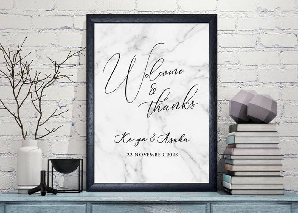 シンプルなウェルカムボードと一緒に、ウェルカムスペースに前撮りの写真を数枚一緒に飾っても素敵。モノクロ印刷した写真や、シックなフレームに入れて飾れば大人っぽくておしゃれなウェルカムスペースが出来上がります。
