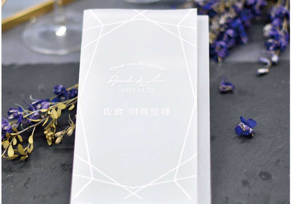 テーブルに置くメニュー表にもこだわりを見せたいところ。黒文字一色モノトーンのメニュー表は、クリアな素材なら高級感がアップします。こちらのメニュー表は席札付きなので、1枚で席札とメニュー表が兼ねられてテーブルコーディネートもすっきりします。