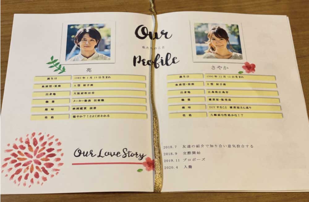 次に作成したのが、二人のプロフィール面。プロフィール面はテンプレートのままで問題無しでした。テンプレートには二人の電話番号・メールアドレスを入れる部分がありましたが、今回は新居住所を最後に入れることにしたので、二人のプロフィールと二人のストーリーだけでページをまとめました。プロフィールもコピー&ペーストで項目を増やすことができるので、ストーリーを入れずにプロフィールを増やしたり、色々アレンジができそうでした。
