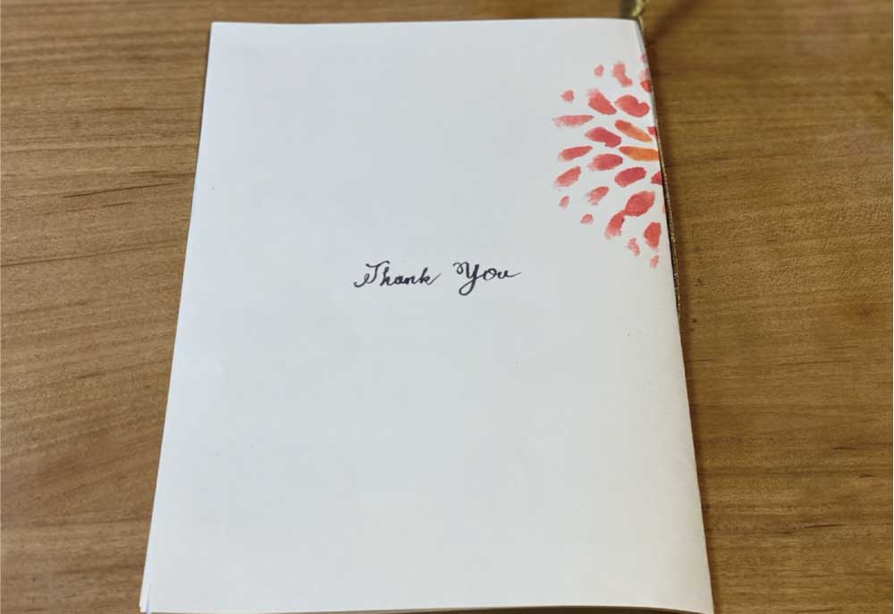 データが完成したところで、いざプリントアウト。両面印刷をする面を間違えないように印刷をかけ、二つ折りにしリボンで留めてみました。