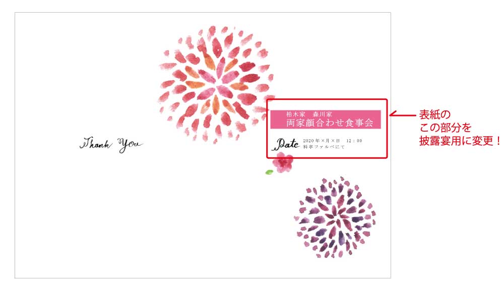 ダウンロードしたテンプレートは表紙のタイトルが「顔合わせ食事会」用となっているので、ここをまず変更。