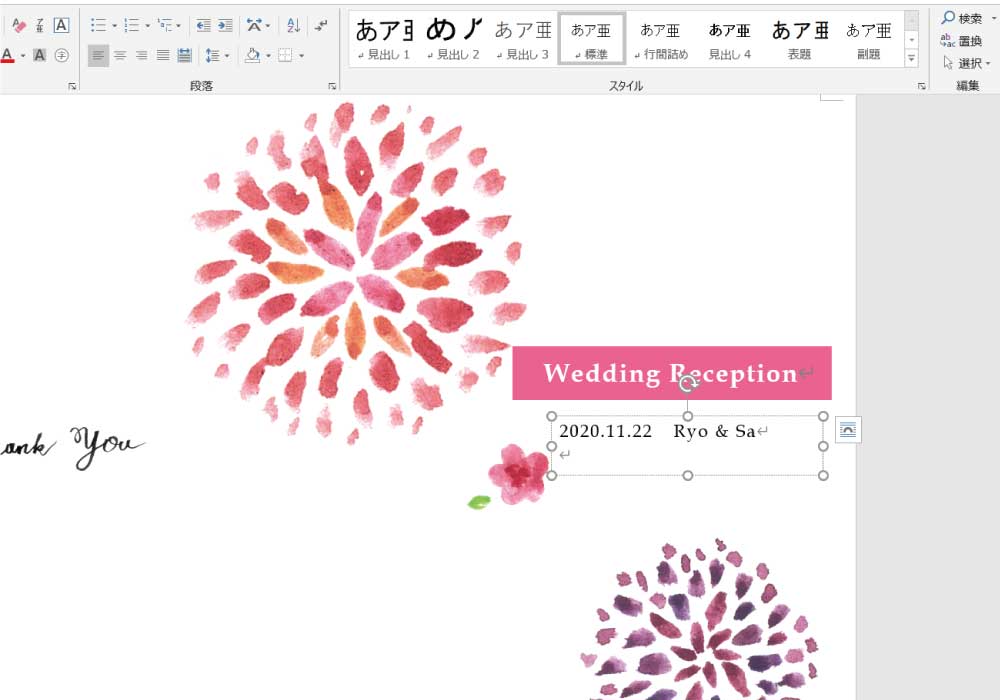 テンプレートは、Microsoft Wordデータなので、文字のサイズやフォントも自由に変えることができます。日本語で「●●家●●家披露宴」などと入れても良いですよね。