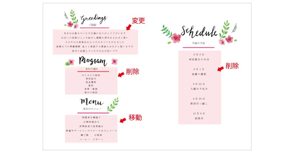 次に2・7ページ面。テンプレートは2ページ目に来る部分に挨拶、プログラム、メニュー、7ページ目に来る部分に今後の予定が入っています。披露宴用では、プログラム、今後の予定は必要ないので削除。今後の予定などを削除したら顔合わせしおりよりも入れる内容が少なくなるため、メニューは他のページへ移動することに。