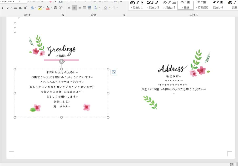 そして、2ページ目に挨拶文、7ページ目に新居住所を入れてみました。挨拶文はテンプレートのままだと顔合わせ会用の文章なので、結婚式用の文章にチェンジ。