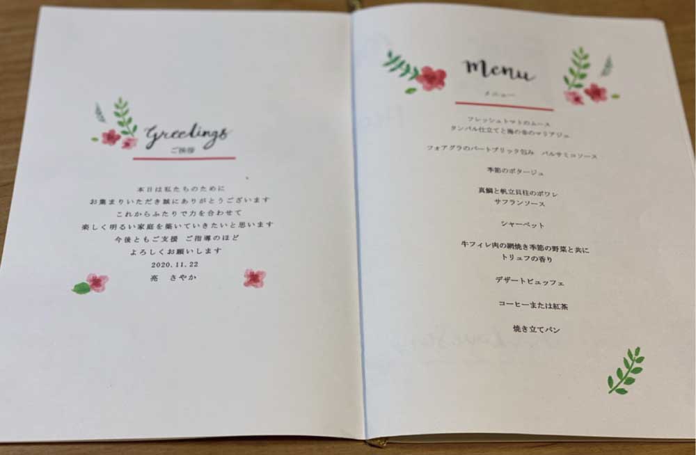 そして、二人のプロフィールの裏面にくるページに入れたのが、両家家族紹介と料理メニュー。家族紹介は新郎家新婦家1ページにまとめました。テンプレートの元の位置から場所を移動させましたが、カット&ペーストで移動できたので、簡単でした。