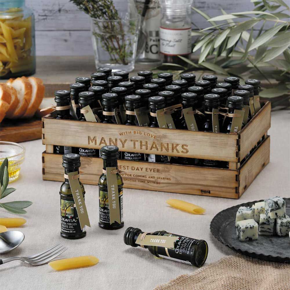 小さな瓶に入ったオリーブオイルは、写真映えすると評判のアイテムです。おしゃれな木箱に詰め込むと、まるでヨーロッパのような素敵な雰囲気を演出できます。瓶詰されたアイテムは高級感も感じられるのでおすすめです。
