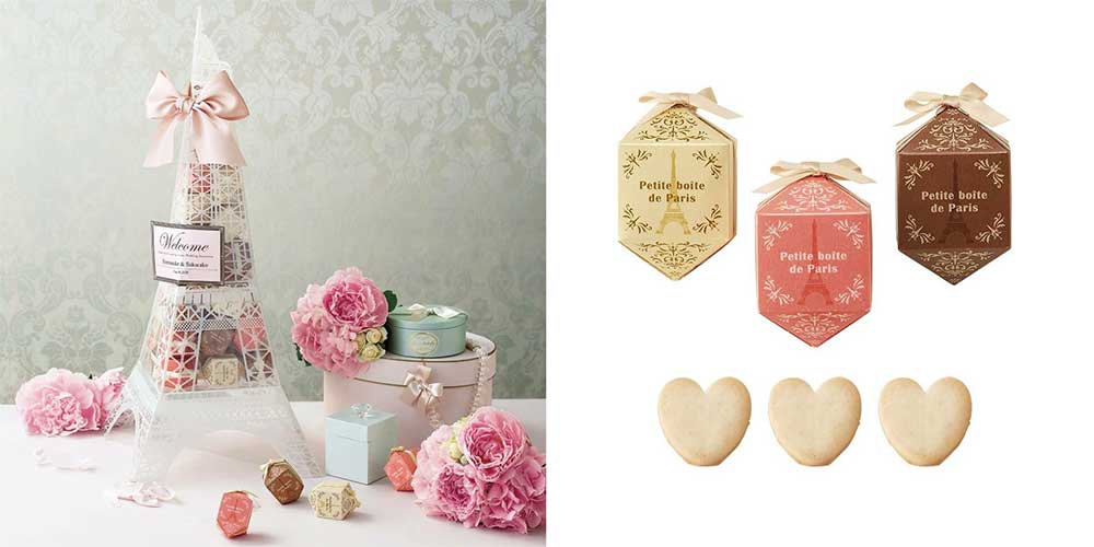 まるでエッフェル塔のようなオブジェの中には、ハート形のクッキーが入った小さなボックスが詰め込まれています。プチギフトをおしゃれなオブジェとして活用すれば、会場の飾りとしても重宝するので、華やかさを求める方にはぴったりです♡