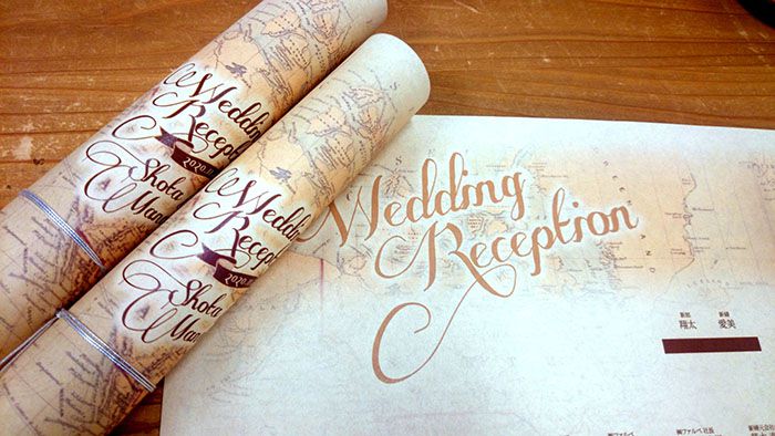 招待状とお揃いタイプの席次表。くるくるロールタイプなので、まるで宝モノ探しの巻物みたい♡