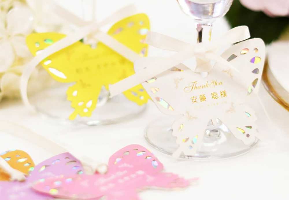 思いっきり春の雰囲気を演出するなら、こんなアイテムも!蝶々の形をした席札タグです。キラキラ輝くペーパーが重なり合っているので、とっても綺麗なテーブルコーディネートが叶いそう。コロナ禍での結婚式では、プチギフトをテーブルに置いておくカップルも多いので、プチギフトに結んでゲストの席に置いておもてなしするのも良いアイデアですよ。