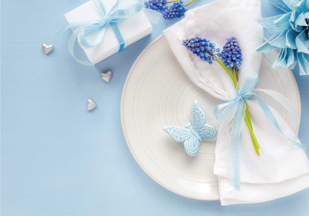 さりげなく舞う蝶々がポイントで入ったブルーが基調の席札は、大人上品なコーディネートになります。ブルーのアイテムなら、「サムシングブルー」も叶えてくれて、テーブルもすっきりとした印象に。かわいらしい雰囲気が好みではない方にもオススメです。