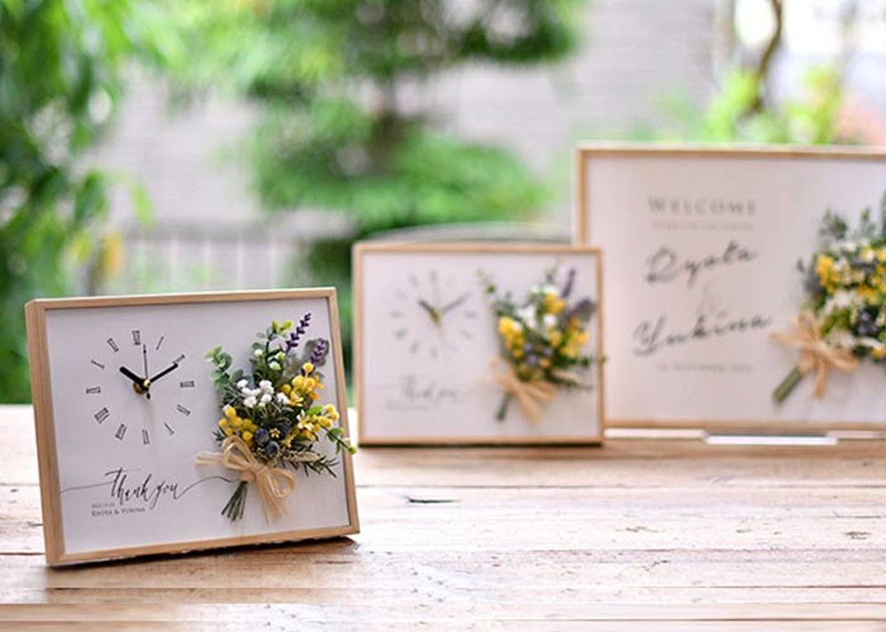 ご両親へのプレゼントは結婚式後もずっと使ってもらえる実用的な時計、自分たちの新居にはウェルカムボードを飾って。お揃いの記念品で3家族の絆ふかまる思い出アイテムに。こちらのアイテムはセットになっているので別々に手配する手間もはぶけてラクチン♪