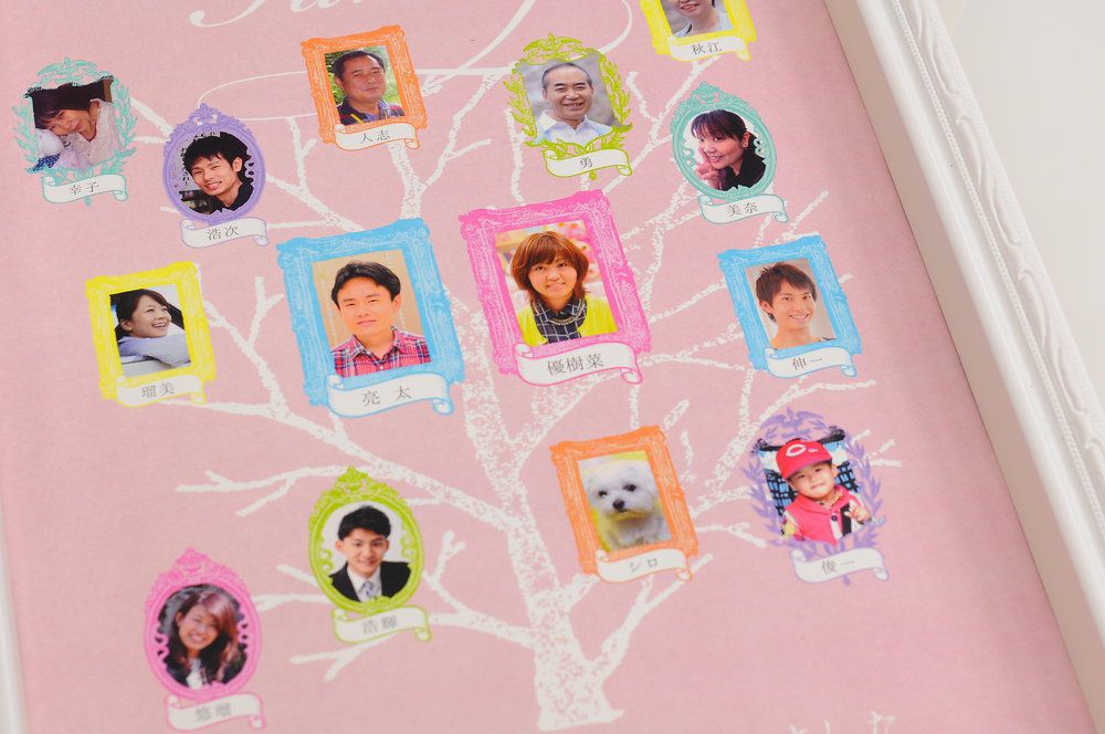 家族家系図の意味を持つファミリーツリー。家族の絆をこんな素敵なアイテムにしてカタチに残しませんか?二人が出会った奇跡の素晴らしさを感じる家系図仕立ての記念品は、まさに新しい家族の絆をお祝いするのにぴったりなアイテムです。