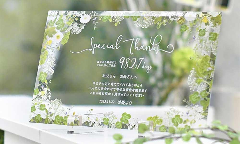 こちらは透明感が美しいガラスの結婚証明書。おふたりの誓いの言葉や挙式日、お名前をレーザー彫刻で刻んだアイテムです。ガラスの縁には明るくみずみずしい植物柄をあしらってナチュラル感もたっぷり♡