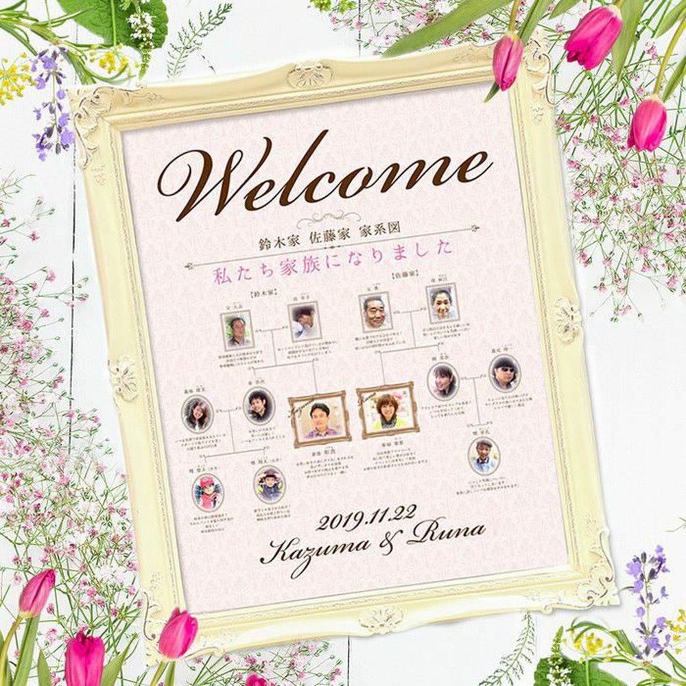 結婚式でゲストをおもてなしするウェルカムボード。家族婚なら、家族の関係性が一目でわかる“家系図デザイン”はいかがでしょうか♪名前のみをつなぐデザインよりも、イメージがわきやすい顔写真付きのほうがおすすめ!新郎新婦からのコメントを見るのも楽しめるデザインですよ。