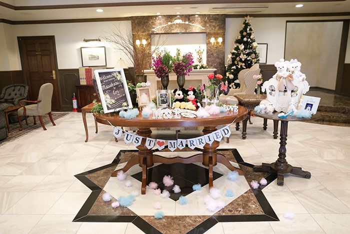 DIYアイデアやアイテムの見せ方も上手な新婦さん。受付に飾ったのはミッキー&ミニーのウェルカムドールやハニカムシンデレラ。LOVE&イニシャルオブジェも飾られとってもイマドキスタイルです。ファルベのウェルカムボードも♡ありがとうございます。