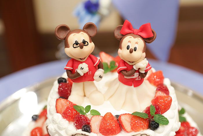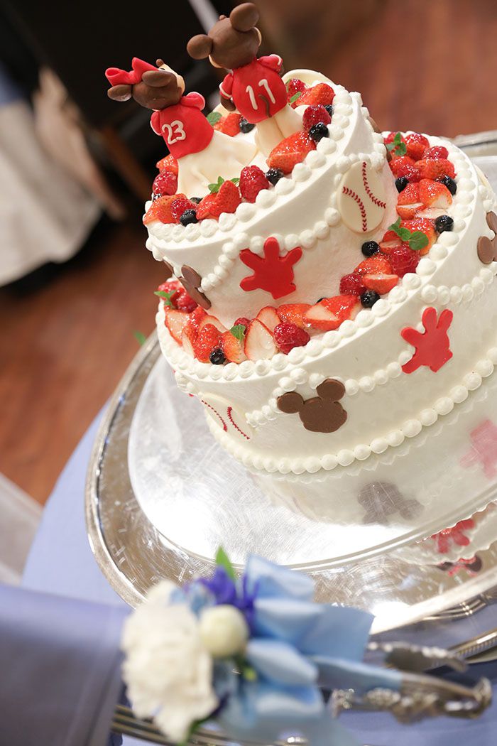 ウェディングケーキのミッキーはなんとカープのユニフォームをきています。そしてそれだけじゃないんです。さらにお顔までお二人に似せて作るというワンランク上の作品です。パティシエさんすごすぎです。背番号はもちろん、結婚式の日で。