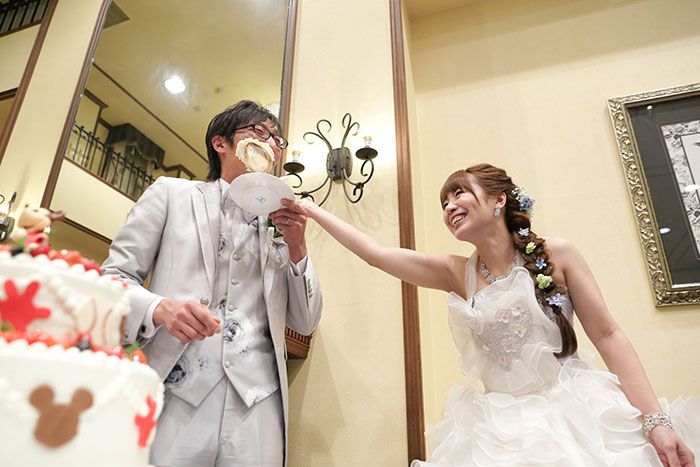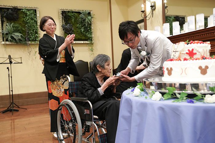 新郎新婦がケーキを食べさせあう演出、ファーストバイトをお二人だけじゃなく、<仲良しバイト>としてお姉さまとおばあささまにも行ってもらったそう。予想もしないサプライズ演出に会場は大盛り上がり。身内の方も参加できる披露宴内容に、ゲストみんながほっこり&感動だったようです。