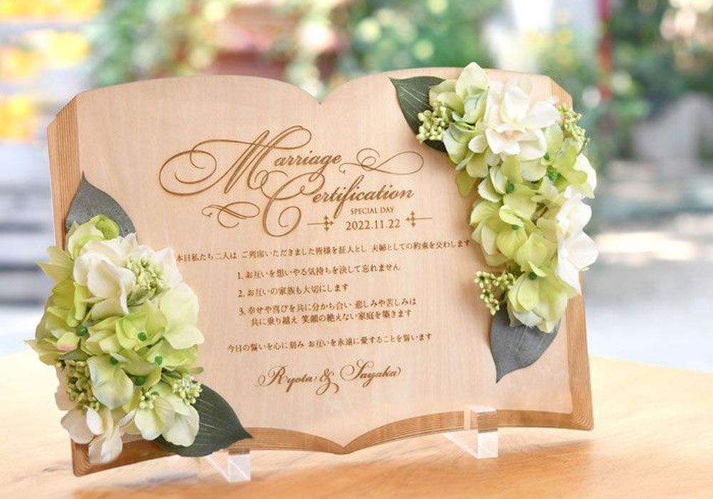ナチュラルな質感のウッドボードにレーザー彫刻をほどこしたあたたかみあふれる結婚証明書。アレンジされているお花は、生花をリアルに再現し、生花にはない美しさを表現して造られたアーティフィシャルフラワー。いつまでも美しいまま記念に残すことができます。