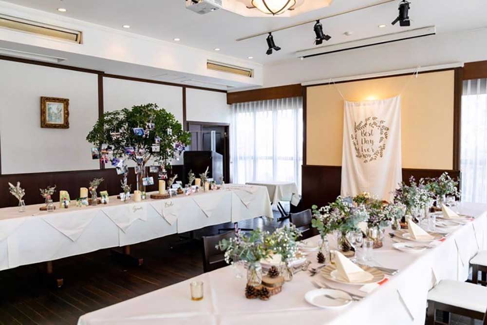 少人数にちょうどよい規模のブラウンを基調にしたレストラン会場と、飾りすぎないシンプルなガーデン挙式だったので、お花やグリーンをふんだんに使ったナチュラルで、お花いっぱいの結婚式を目指しました。