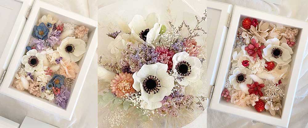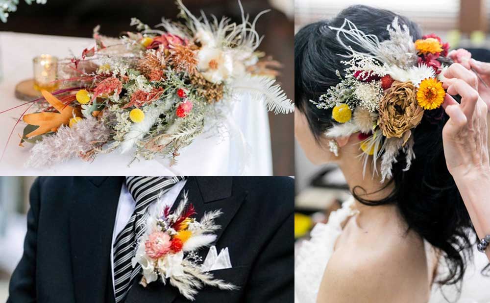 元々30人程度の少人数婚予定でしたが、コロナの影響で親しかゲストがいなくて6人だけだったので、ゆっくりアットホームに過ごせるようにしました。また、お花がいっぱいになるように準備しました。ウェディングドレスのブーケやブートニア、ヘッドパーツは、プロポーズされたドライフラワー店で、自分たちで作りました。また、お色直し用のブーケ、ブートニア、ヘッドパーツは、花材をアーティストさんと何度も打ち合わせて、作っていただきました。