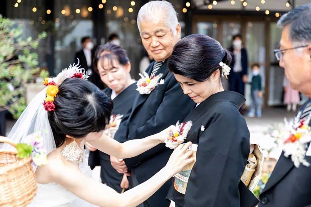 さらに、両親たちには、ブーケの花材をモチーフにした、コサージュを作り、コサージュセレモニーをして新婦から付けました。6人で統一感が出て、アットホームな感じがさらに出ました。