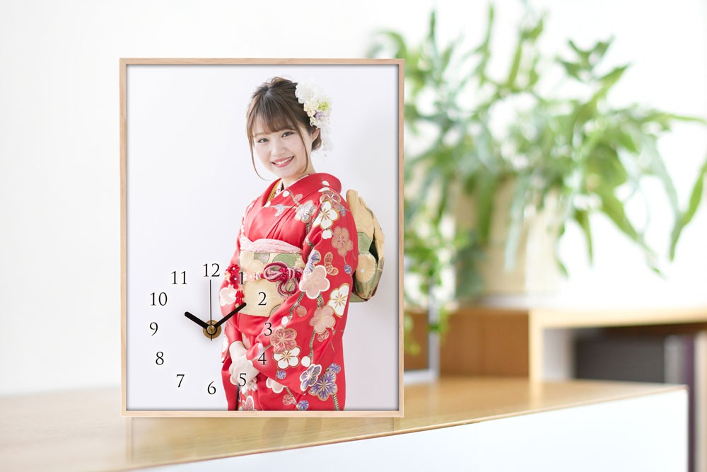 お写真を全面にレイアウトしたフォトクロック。時間を見るたびにハレ姿が目に入って毎日うれしい気持ちになってもらえる!ずっと飾れて記念に残せるプレゼントです。