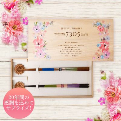 高級感ある桐箱に感謝のメッセージと日数をUV印刷した子育て感謝状夫婦箸セット。お箸は高品質でありながら日常使いしやすい福井の老舗メーカーの若狭塗箸。