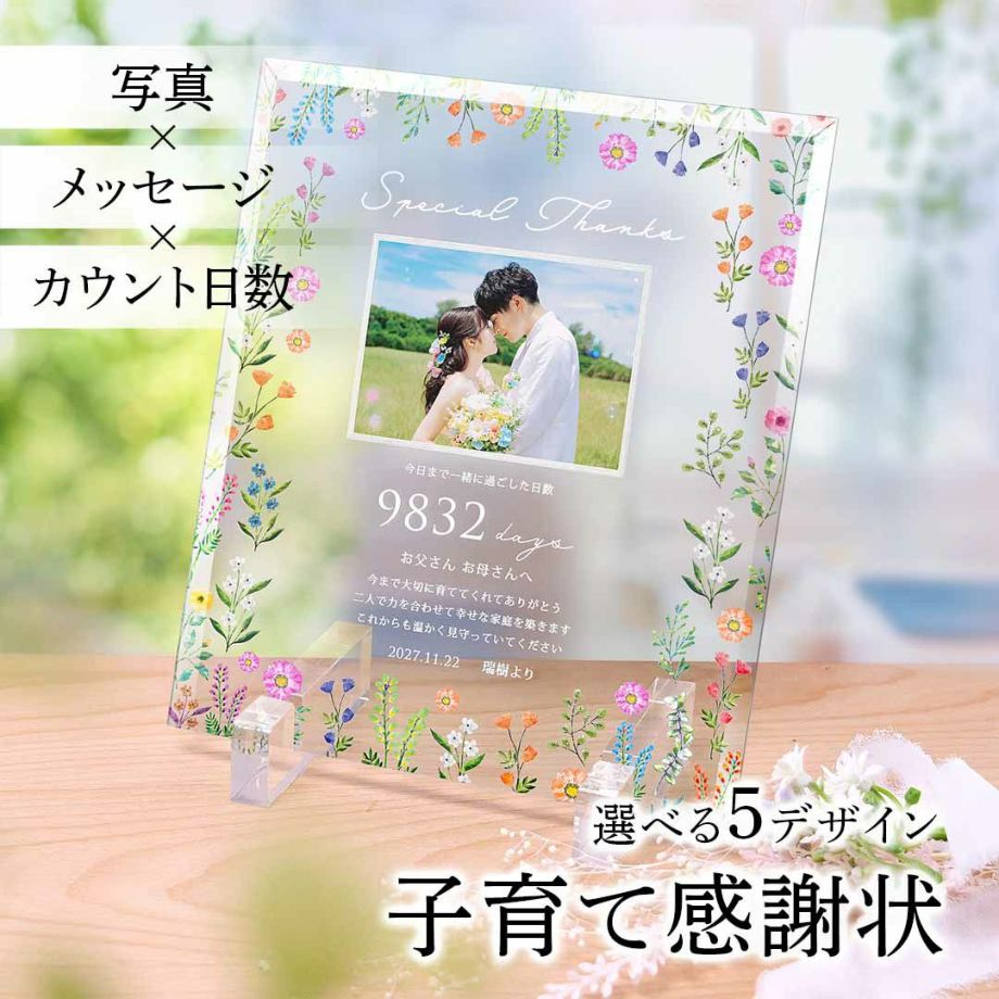 透明感あるアクリル素材に、ソラフラワーとドライフラワーのブーケを丁寧にあしらった特別な子育て感謝状。とっておきの1枚を入れられる写真ありタイプと、シンプルに想いを伝えたい方におすすめの写真なしタイプもご用意しています。
