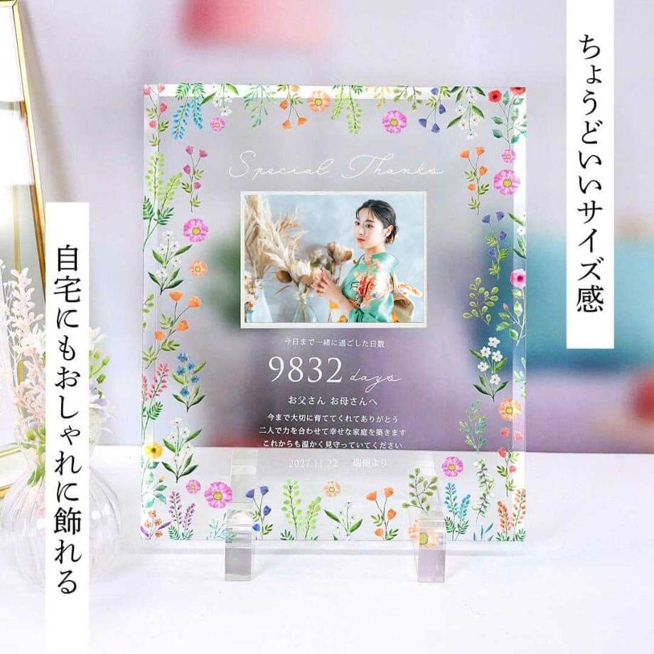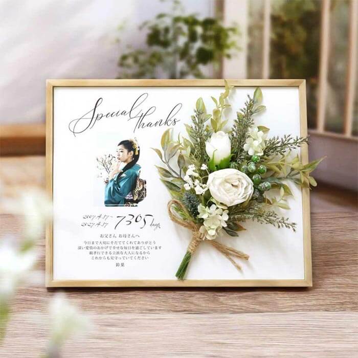 写真の準備が難しい人はお花がアレンジされたメッセージタイプの感謝状を。こちらも生まれてから成人まで、育ててもらった日数入りの感動ギフトです。