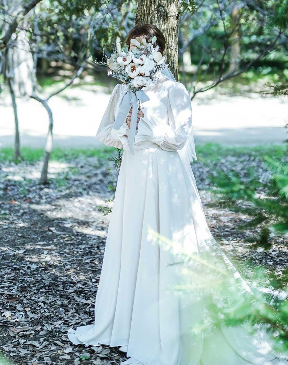 「いとこが作ってくれたお気に入りのブーケとフルオーダーで作ったこだわりのウェディングドレス」という素敵な一枚。トータルで統一感を意識されたというだけあって、自然の中で行うアウトドアウェディングというテーマにピッタリです!