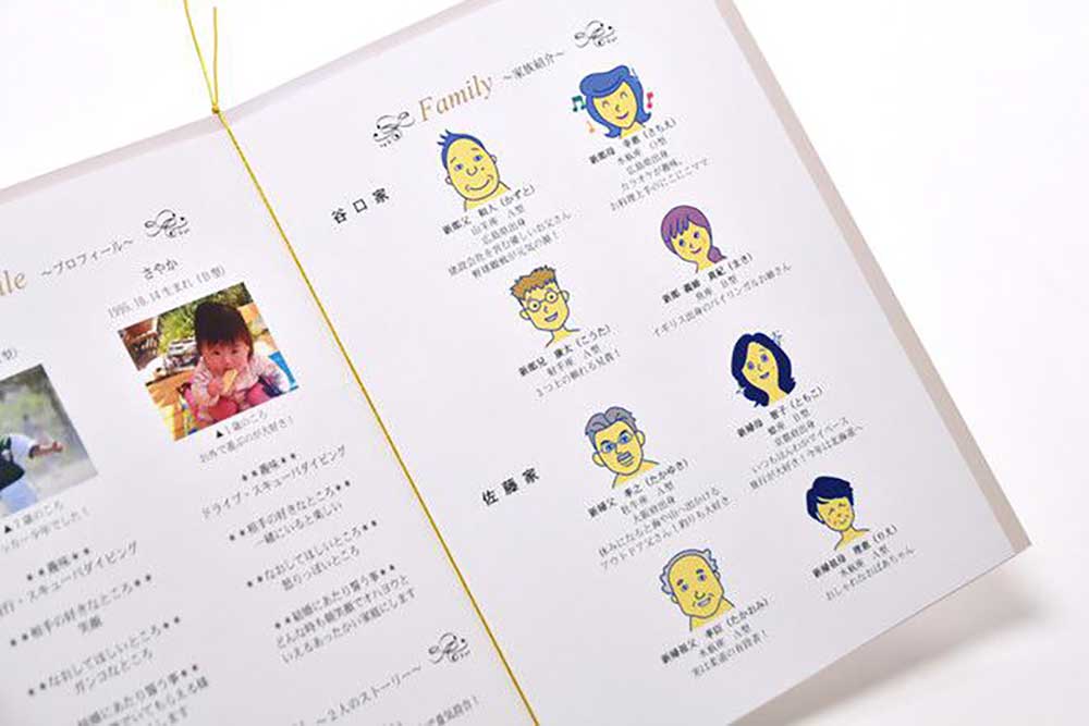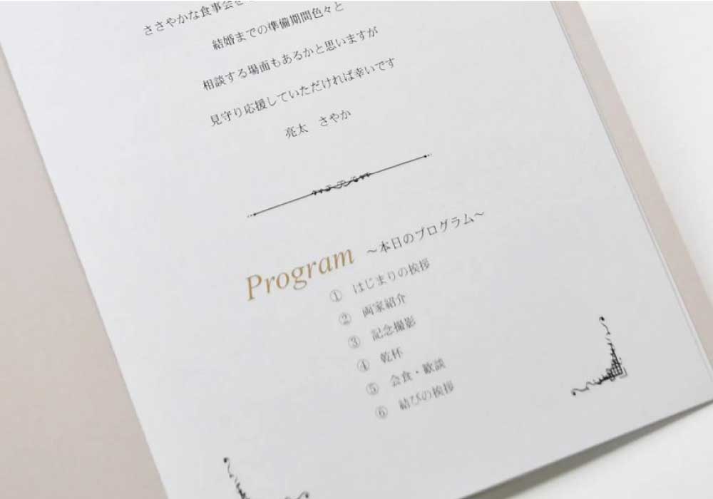 今や顔合わせ食事会の定番となっている顔合わせしおり。オンラインの場合は、作成したしおりを事前に両親へ渡しておきましょう。遠方に住んでいる場合は、飲み物や手土産などと一緒に送っておけばOK。通常の顔合わせ食事会の場合は、あまり文字が多いと読むことに集中してしまいがちですが、事前に渡す場合は、内容を充実させて作りましょう。両家家族紹介も情報を少し多めに入れてもいいですし、二人の出会いやヒストリー、記念品についてなど、盛り沢山の内容で作れば、事前にご両親が情報を頭に入れておくことができますよ。