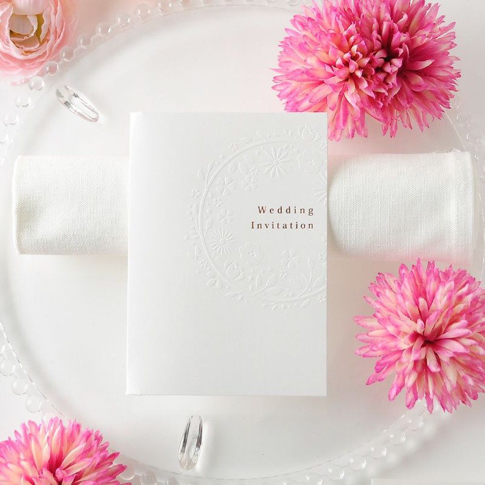 純白パールに可憐なフラワーモチーフを浮き上がらせた清楚なデザイン。台紙にはさりげないホワイトパールのような輝くペーパーを使用しています。ウェディングならではの繊細で上品な仕上がり♡