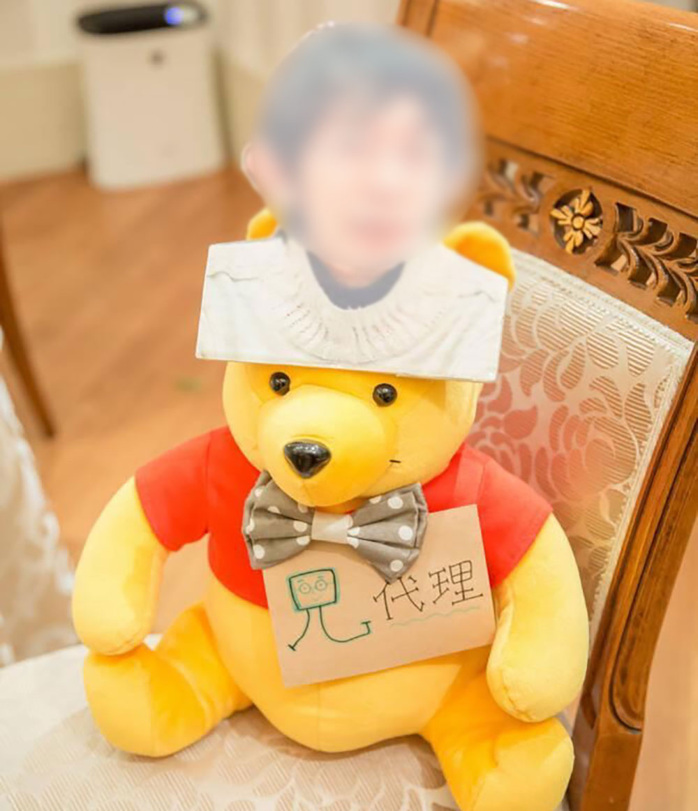 地方在住ということで、当日このご時世で残念ながら欠席となってしまった新郎のお兄さま。代理人として、新婦手作りのお兄様お面をかぶったユニークなプーさんをお席に置いたそうですよ(^^)