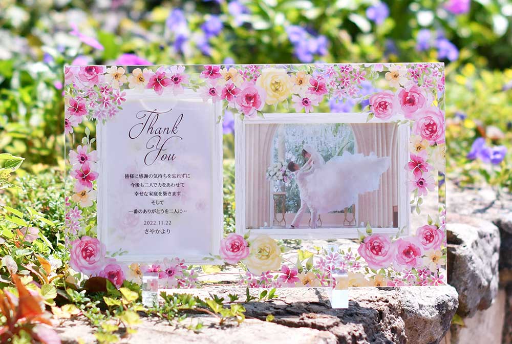 春らしいカラーのお花やボタニカルのデザイン入りのギフトアイテムは人気アイテム!中でもガラスやアクリルのような「クリア素材」との組み合わせは、全体に軽やかさと抜け感がプラスされて、一気に明るい印象に。春婚らしいアイテムを選ぶことで、ご自宅でご両親がそれを目にするたび、当日の雰囲気や様子を思い返すことができます。