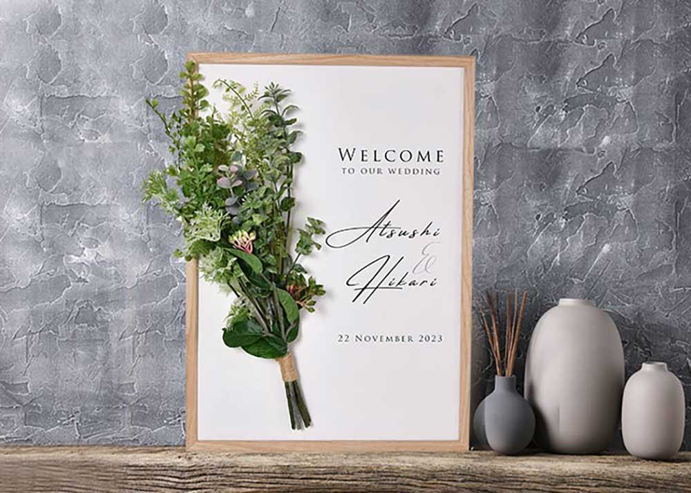 グリーンが綺麗な季節だからこそ、本物の植物やお花を飾ってナチュラルテイストのウェルカムスペースを演出するのも。クリアなガラスやアクリルのウェルカムボードは、グリーンが映えてオシャレになります。