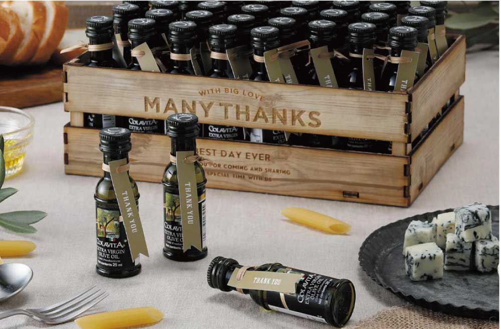 ゲストへ配るプチギフトも5月らしさを出したいところ。爽やかなボトルのプチギフトは、なんとオリーブオイルのギフト。